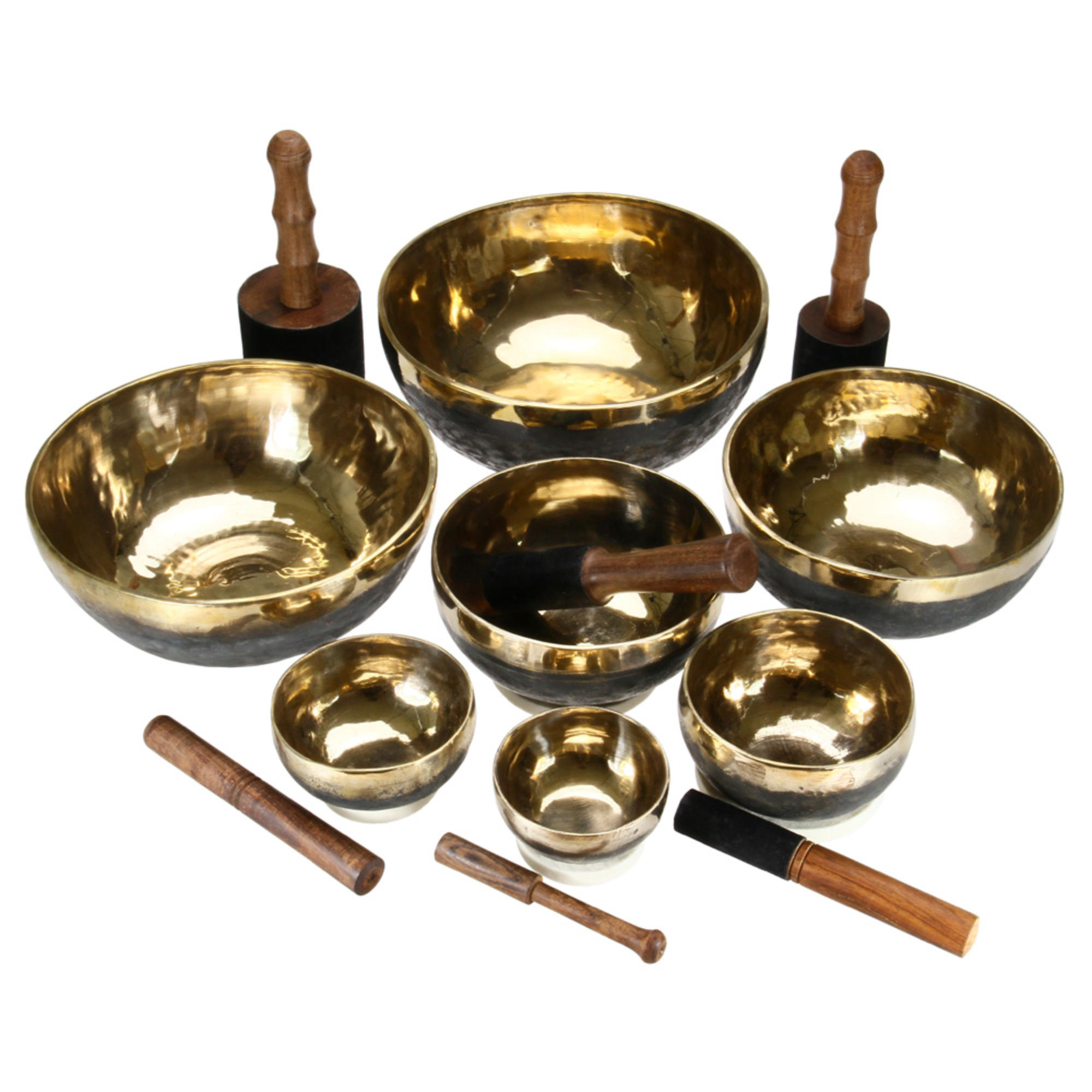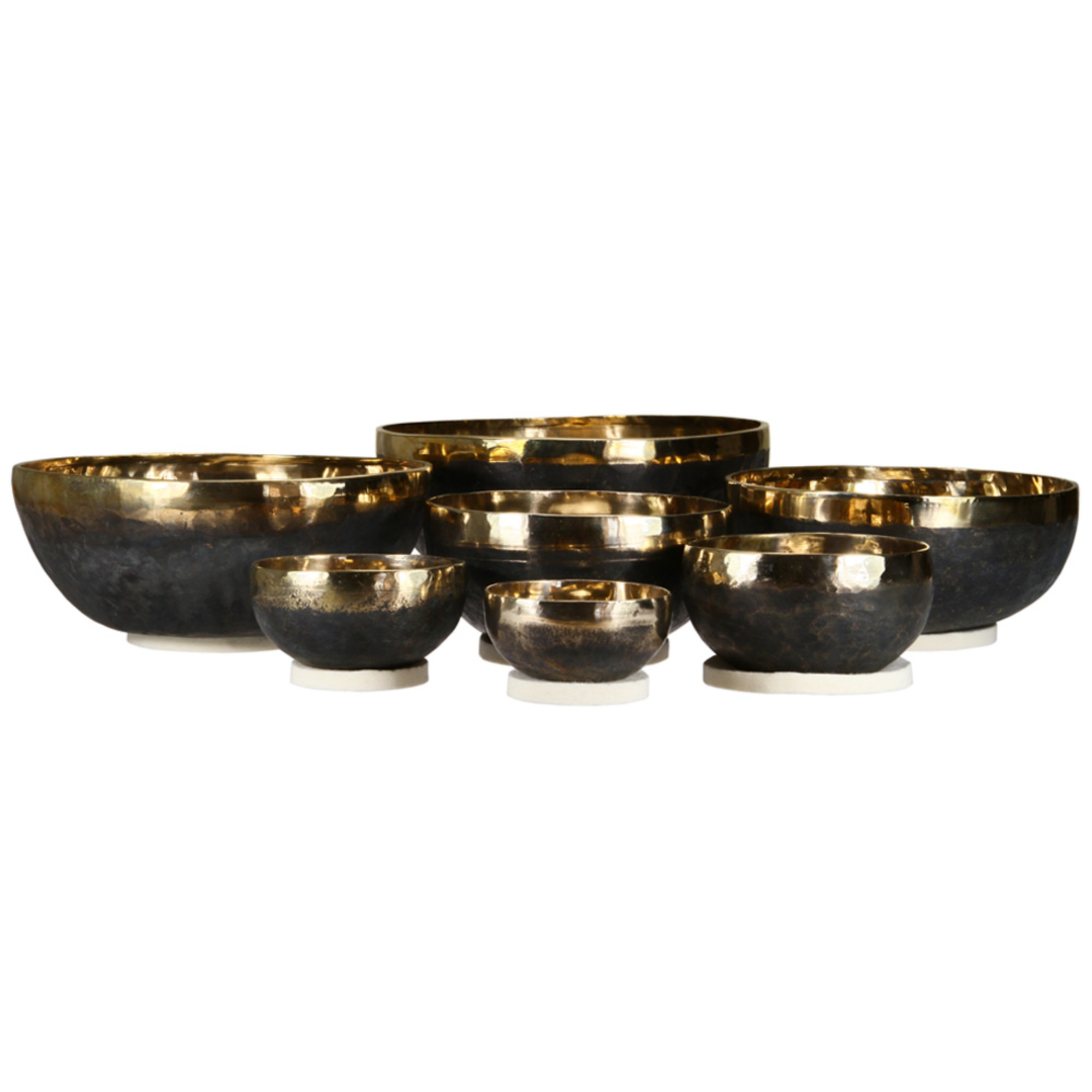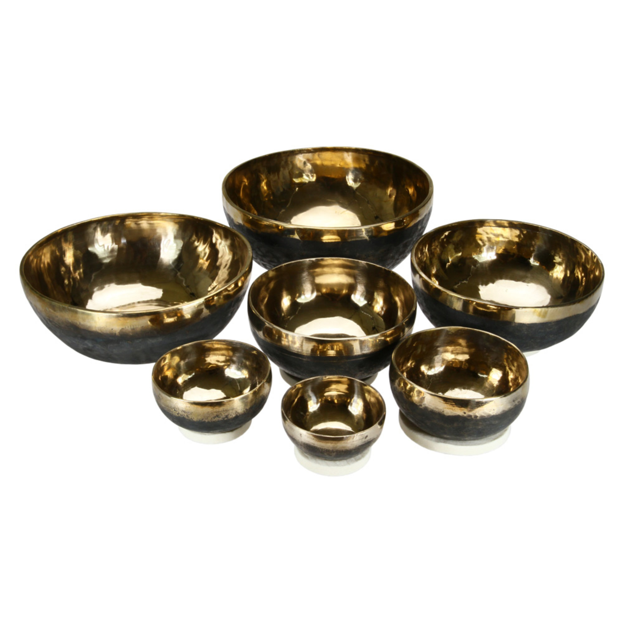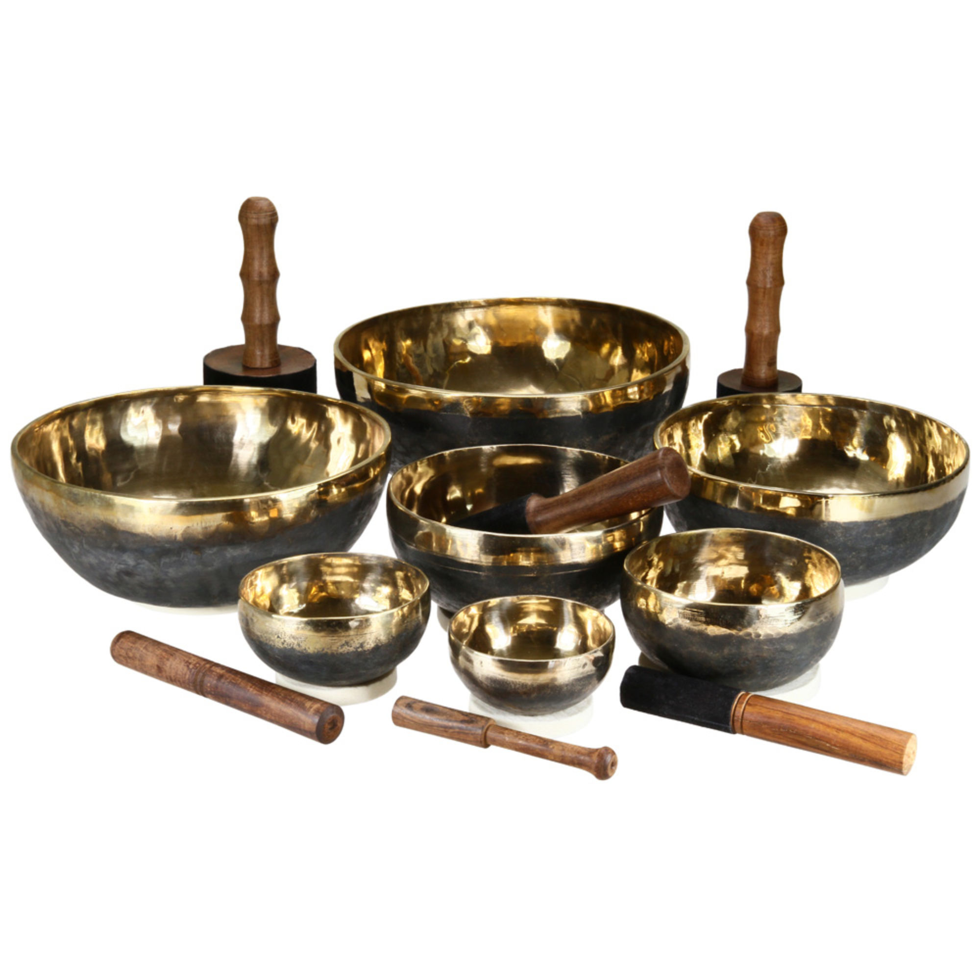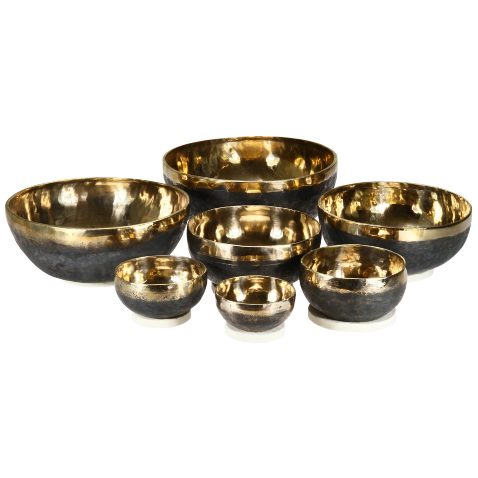 The Arhat singing bowls, hand-forged in Nepal from a high-quality bronze alloy, stand out especially for their primitive design. The outer side of the bowls retains the forge blackness at the bottom and is only polished at the upper rim, while the inside is fully polished. Struck or rubbed, the bowls produce a long-lasting, overtone-rich, and fine sound. Therefore, the bowls are ideal for meditation and therapy.