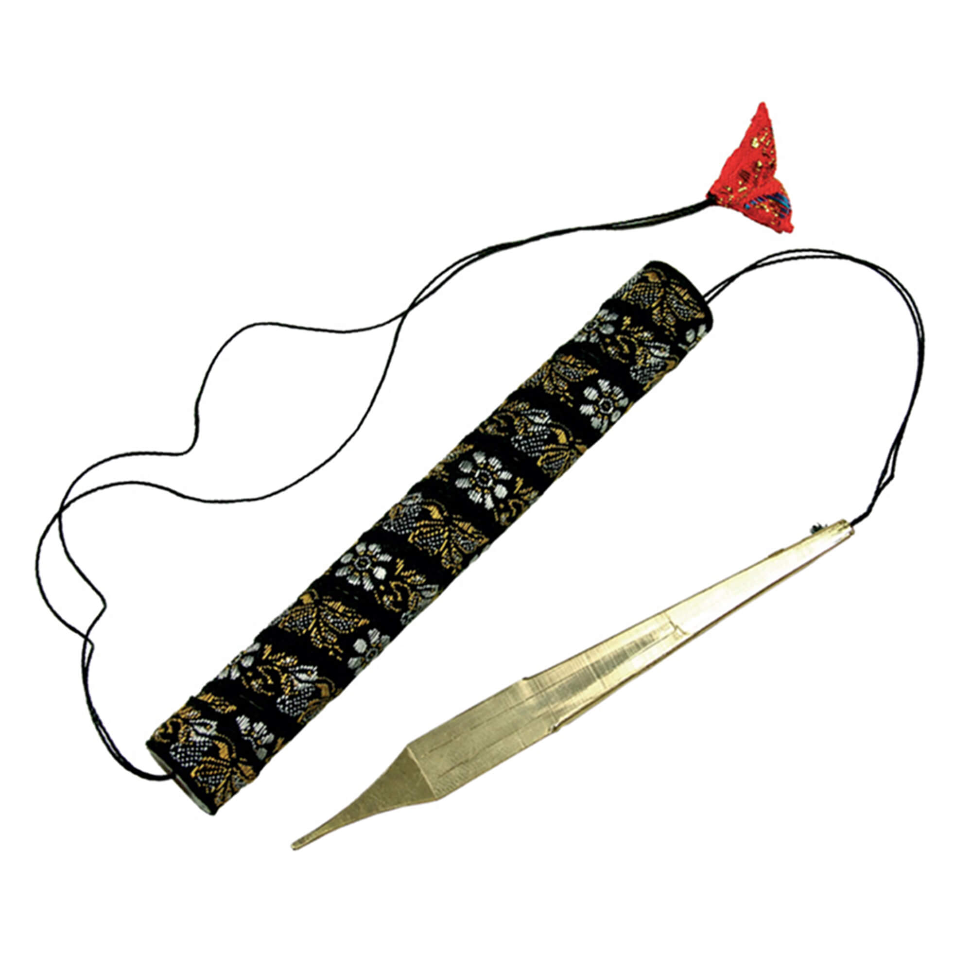 The big sister of the Standard Dan Moi is slightly larger and has a deeper sound. This lip jaw harp is traditionally handcrafted from brass in northern Vietnam. A thread connects it to a bamboo case, which is wrapped in colorful fabrics—each case is unique. Vietnamese jaw harps are characterized by their easy playability, beautiful, overtone-rich sound, and affordable price.