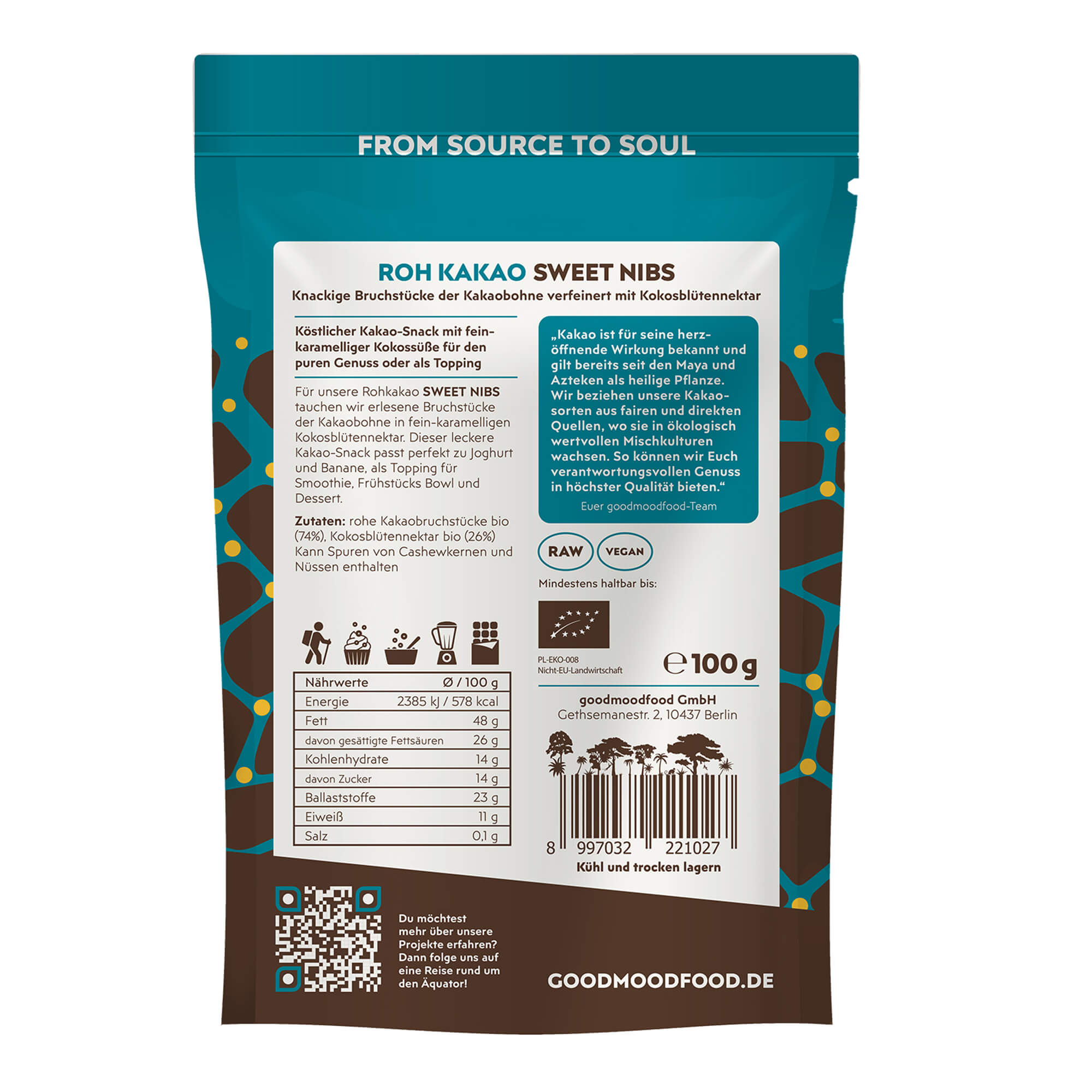 For those who like it a little sweeter: this healthy snack combines the subtly tart taste of raw cacao nibs with the caramel-like sweetness of unrefined coconut blossom sugar. The sweet nibs are perfect as a topping for muesli, for making smoothies or as a snack between meals. The cocoa beans come from small farmers' cooperatives in the Peruvian Amazon region around Pucallpa, while the coconut blossom nectar comes from smallholder mixed cultures in Indonesia.
