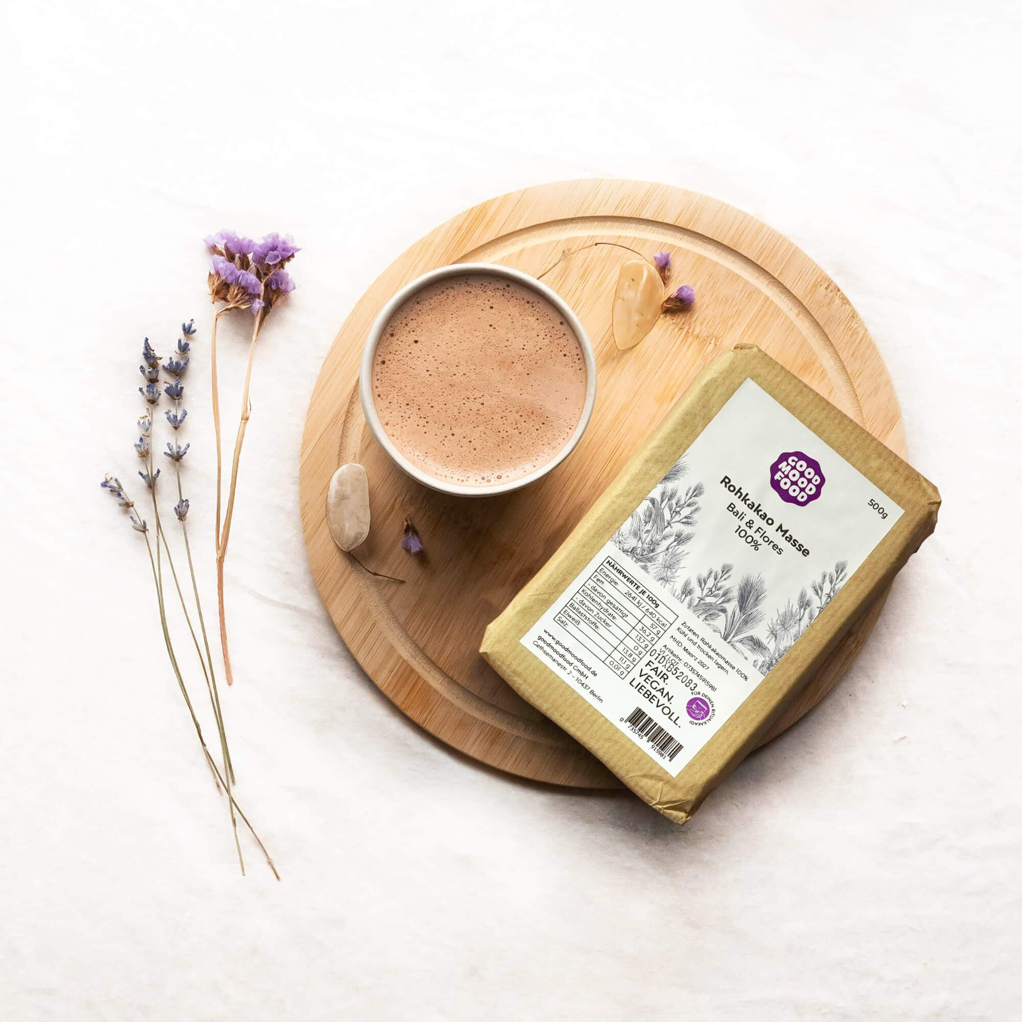 30 g Kakaomasse in 250 ml warme Pflanzenmilch oder Wasser auflösen und je nach Geschmack Kokosblütenzucker und Lieblingsgewürze hinzufügen. Das Getränk nicht heißer als 42°C werden lassen, um alle wertvollen Inhaltsstoffe zu bewahren und das volle Aroma zu genießen. Mit einer kleinen Prise Salz kommt der herrliche Kakaogeschmack noch besser zur Geltung.