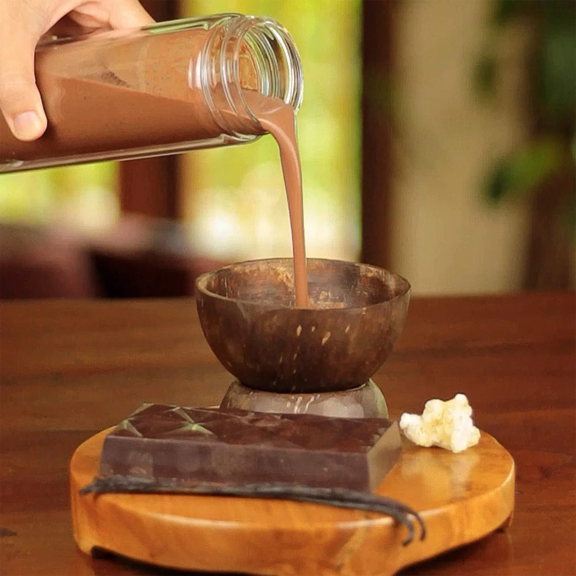 30 g Kakaomasse in 250 ml Pflanzenmilch oder Wasser erwärmen (nicht über 42 ° C, um alle wertvollen Inhaltsstoffe zu erhalten), je nach Geschmack Kokosblütenzucker und Lieblingsgewürze hinzufügen.
