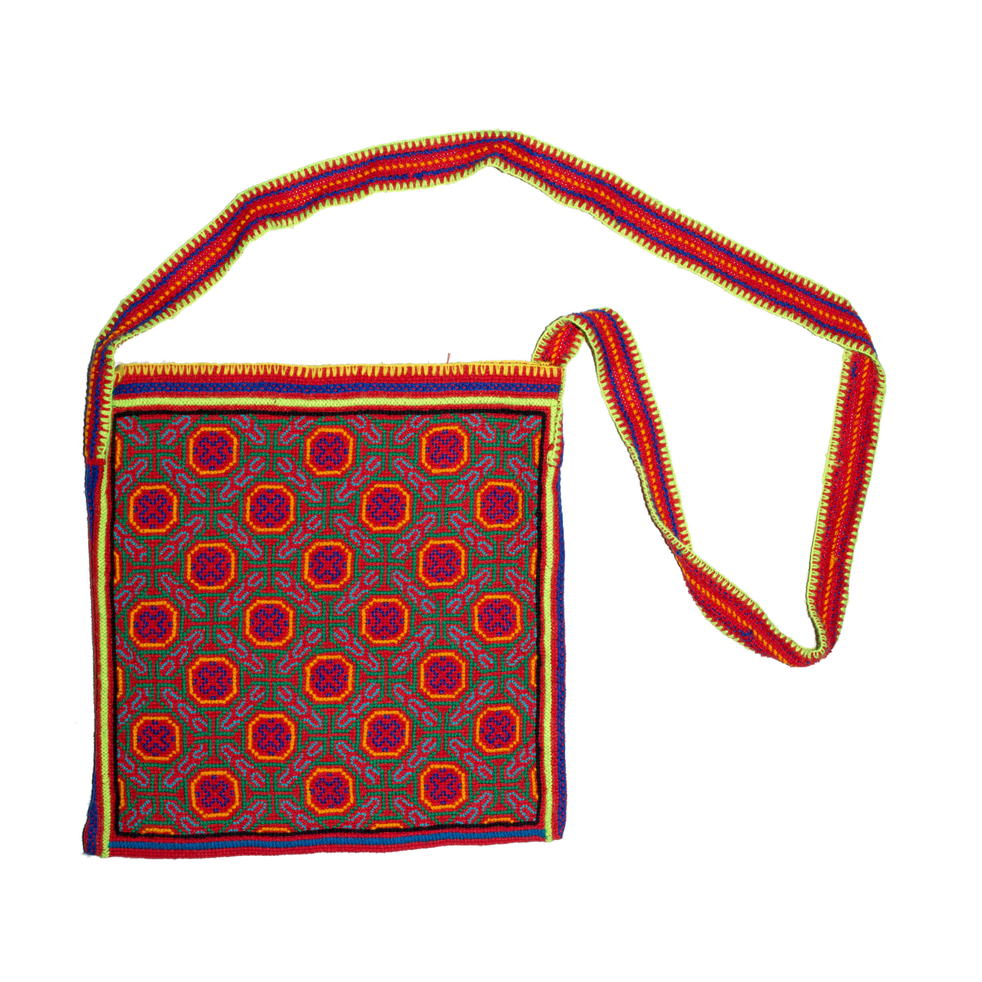 Kleine handbestickte oder bemalte Tasche mit langem Schultergurt.